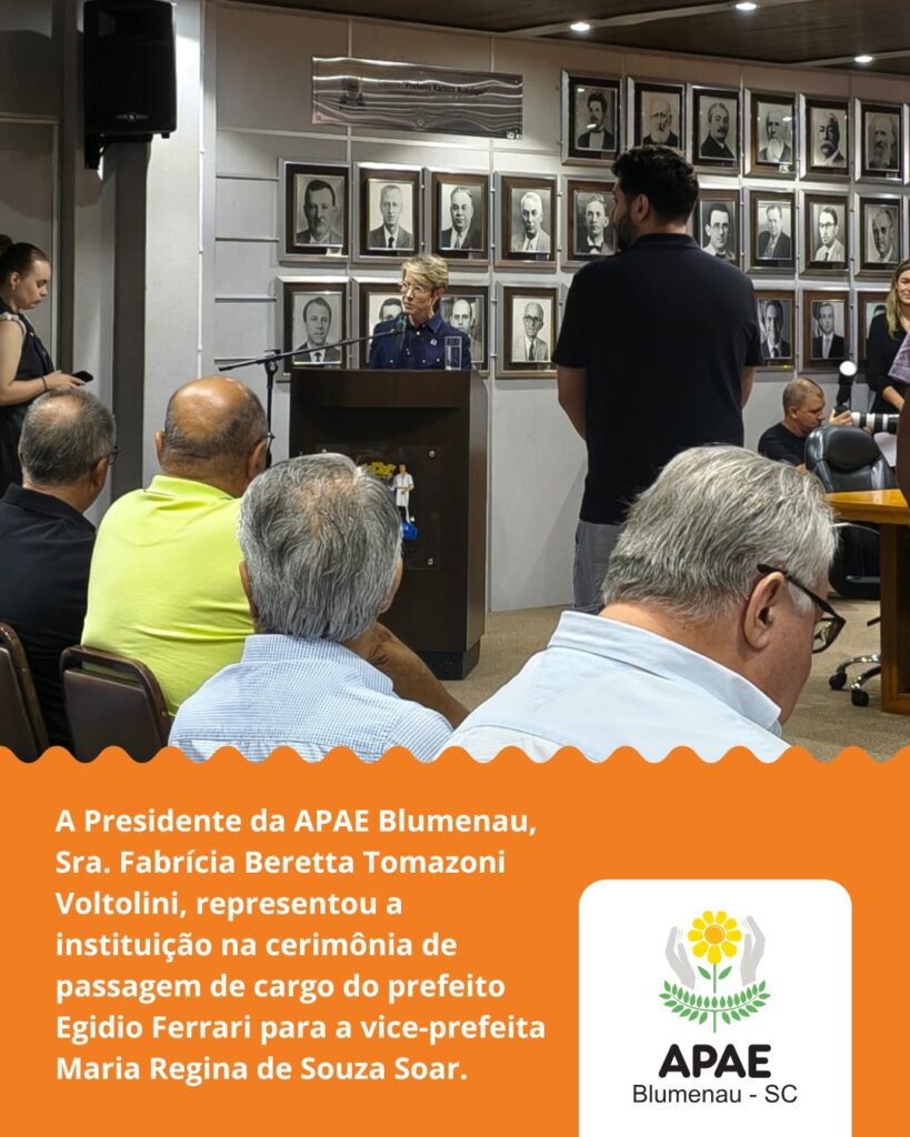 A APAE Blumenau esteve representada pela Presidente da entidade, Sra. Fabrícia Beretta Tomazoni Voltolini, na manhã desta terça-feira, 24/02, durante a cerimônia de passagem oficial de cargo do prefeito Egidio Ferrari para a vice-prefeita Maria Regina de Souza Soar.